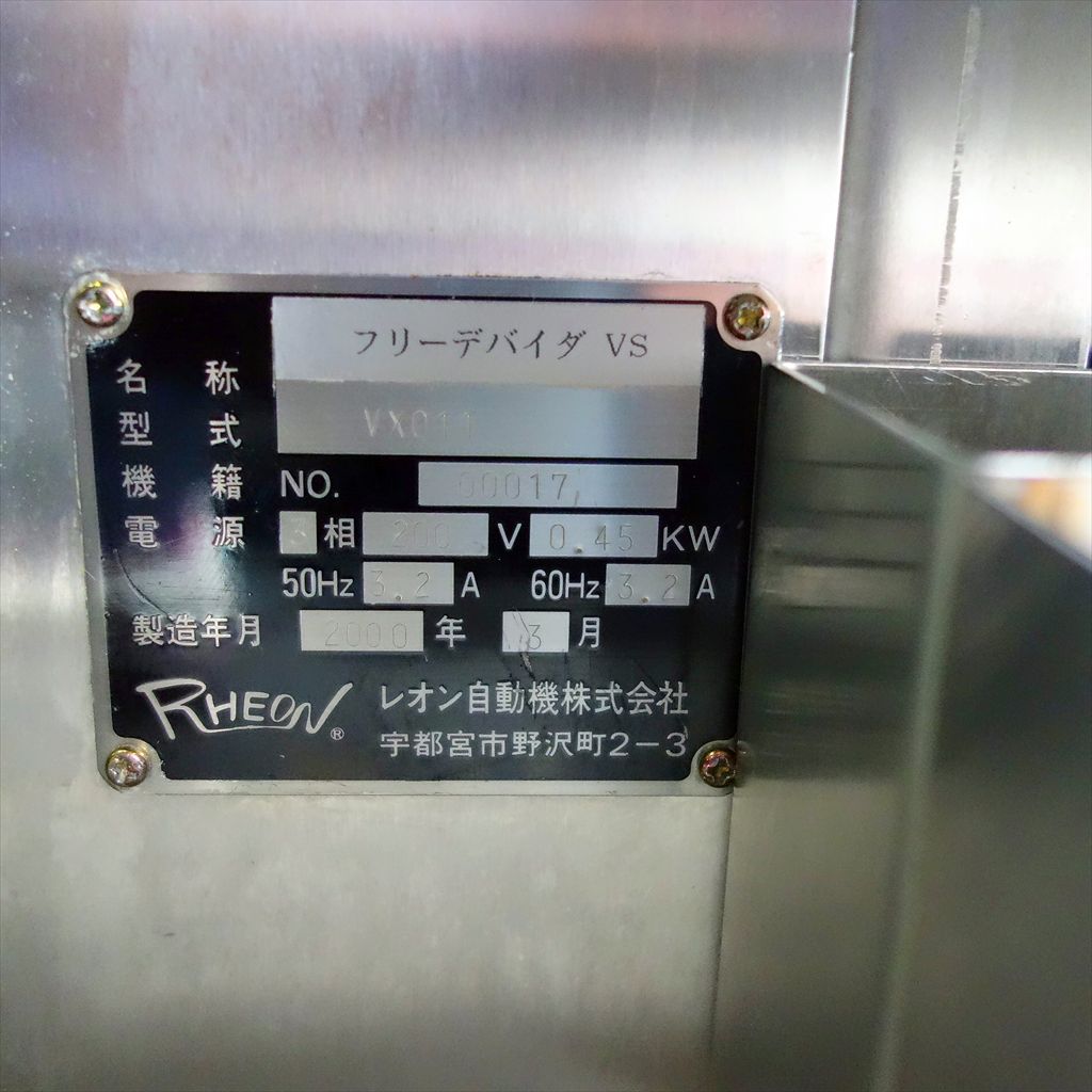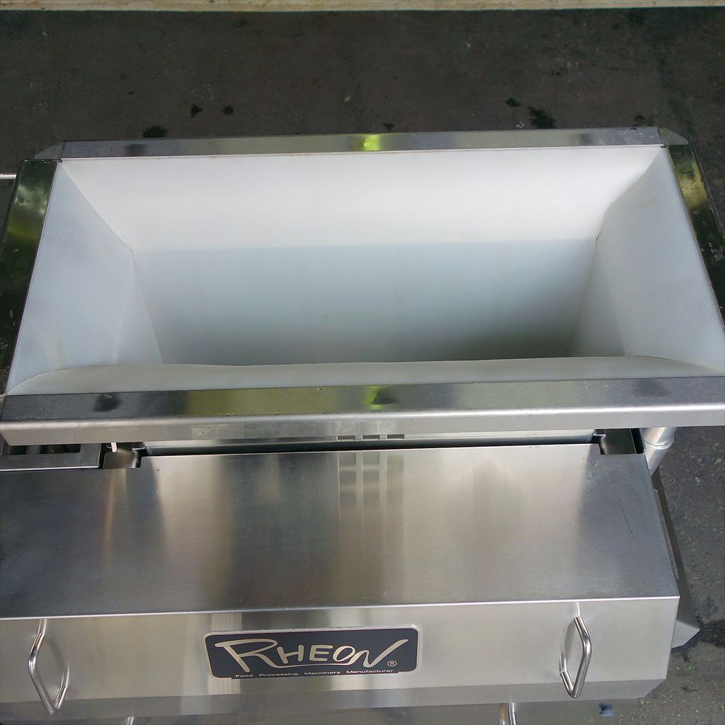 年式:2000年製 製菓・製パンのトップメーカー「レオン(RHEON)」のフリーデバイダです! 様々な種類のパン生地を指定した分量に分割可能な ストレスフリーシステム搭載の分割成形機です。 従来は、パン生地の体積に合わせて分割するのが一般的でしたが、 本装置は「重量」を量って分割する「秤量分割機」として注目を集め、 現在ではスタンダードプレーヤーとなりました。 製パン工場には必須! 中規模店舗でもこれ1台あれば人員削減は確実!! その上、熟練職人の作業クオリティ! 生産性は上がり人件費削減の良い事ばかりですね! ◎各パーツ及び搬送ベルト 分解清掃済み ◎動作確認済み(エイジング3/H以上) ◎筐体上部 アクリル小窓 新品交換済み ◎エアーフィルタ×2 新品交換済み ◎停止スイッチ及び緊急停止スイッチ 新品交換済み ※各種設定につきましては、お客様とメーカー様にてお願いいたします。 当社のメンテナンス商品は食品が接触する 可能性の有る駆動部分に 食品機械専用グリースを使用しております。 また、原則として当社の商品(主に機械類)には 除湿剤を内包保管し発送いたしております。 前使用者:製パン工場 (2015年1月まで使用されていました。) <見学・下見可能です> 整備清掃渡し【即納・即稼働可】 |