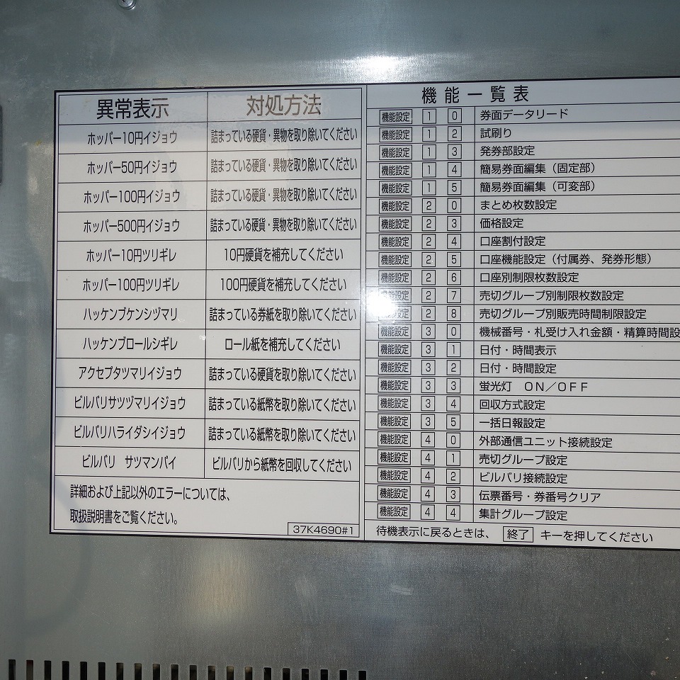 年式:2007年製 消費電力:61W 最大口座(ボタン)数:55口座 設定可能金額:10円~9,000円(10円刻み) 用紙:感熱ロール紙(5.75mmx300mm) 切替方式:リレー式 印字内容:日付・時間・金額・番号・その他任意文字 給紙方法:オ―トローディング方式 券サイズ:57.5x21・30・39・48・57・87(mm)(MAX:120mm) 印字書体:ゴシック体・明朝体 集計機能:日計(口座別)・累計(口座別)・時間帯別集計 金銭入出庫・取引データ回収結果 取説がございますので、別途御見積になりますが、 メニュー表示・食券印字・金額設定等 各種変更作業も可能です。 また、メーカー様にて詳細設定も可能です。(有償) ◎筐体清掃済み ◎内部清掃済み ◎ビルバリ(お札吸込口)内清掃済み 当社のメンテナンス商品は食品が接触する 可能性の有る駆動部分に 食品機械専用グリースを使用しております。 また、原則として当社の商品(主に機械類)には 除湿剤を内包保管し発送いたしております。 前使用者:小規模飲食店 (2015年12月まで使用されていました。) <見学・下見可能です> |